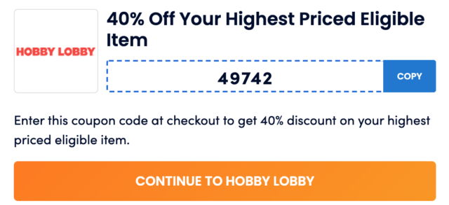 50% OFF | Hobby Lobby Coupons | June 2022 Promo Codes in Hobby Lobby coupons 40% OFF COUPON CODE Take 40% Off + Free Shipping Using Code Enjoy 40% Discount on Eligible Items sitewide using code, plus Free Shipping on $50 or more 548 Show Coupon Code in Hobby Lobby coupons 40% OFF COUPON CODE Save 40% Off with Code Get Up to 40% Off on Select Products 759 Show Coupon Code in Hobby Lobby coupons 40% OFF