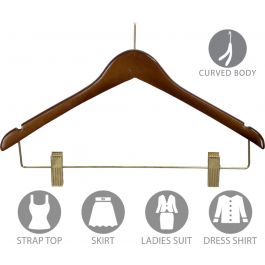 17" Brown Wood Anti-Theft Hanger W/ Clips & Notches